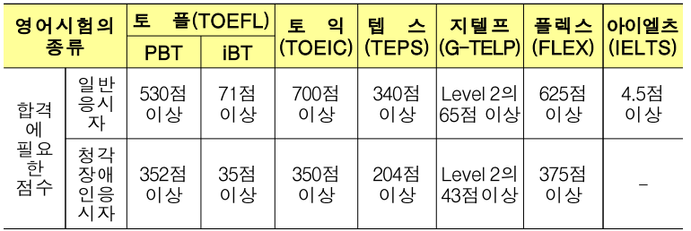 영어검정능력시험은 검정기관별 아래의 기준 점수 이상이어야 하며 2022년 1월 1일 이후 실시된 시험의 성적이어야 합니다. 공인영어성적의 유효기간이 2년에서 5년으로 연장되었으며 토익과 같이 검정기관 자체 유효기간이 2년인 경우에는 유효기간 만료 전에 사전등록을 하여야 합니다.