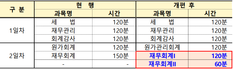 2025년부터 적용되는 개편 사항을 반영한 시험과목은 세법(계산문제, 약술형 10% 출제), 재무관리, 회계감사(직업윤리 포함, IT비중이 5%에서 15%로 증가), 원가회계, 재무회계 I(중급), 재무회계 II(고급)으로 총 6과목이며 배점은 재무회계 II (50점)을 제외한 나머지 과목은 모두 100점입니다. 재무회계 과목 분리로 개편된 2차 시험 시간표는 아래를 참고하시기 바랍니다.