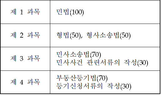 2차 시험과목은 제1과목(민법), 제2과목(형법, 형사소송법), 제3과목(민사소송법, 민사사건 관련서류의 작성), 제4과목(부동산등기법, 등기신청서류의 작성) 총 4 과목으로 논술형 주관식 시험입니다. 과목별 배점 비율은 아래와 같습니다.