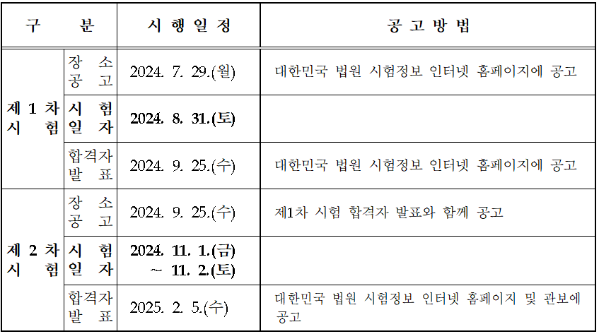2024년 시험일정은 1차 시험이 8월 31일, 2차 시험이 11월 1일에서 2일까지 2일간 있습니다. 이를 참고하면 2025년도 시험일정이 1차는 8월 말, 2차는 11월 초에 있을 것으로 예정되니 이에 맞게 수험 준비를 하시면 될 것입니다.