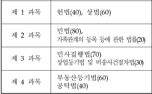 1차 시험과목은 제1과목(헌법, 상법), 제2과목(민법, 가족관계의 등록 등에 관한 법률), 제3과목(민사집행법, 상업등기법 및 비송사건절차법), 제4과목(부동산등기법, 공탁법)으로 이루어졌습니다. 많은 법률을 포함하고 있습니다. 각 과목별 배점 비율은 아래와 같습니다.