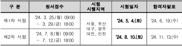 2024년 시험일정상으로 1차 시험은 5월 4일, 2차 시험은 8월 10일에 있었습니다. 이를 감안할 때 2025년 시험 일정을 예측해 본다면 1차 시험은 5월 첫째 주 토요일, 2차 시험은 8월 둘째 주 토요일로 하여 시험 준비를 하면 되겠습니다. 구체적인 시험일정은 12월 큐넷을 통해 공지됩니다.