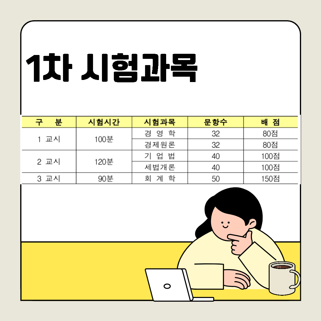 객관식 시험으로 경영학, 경제원론, 기업법, 세법개론, 회계학 등 5과목을 치릅니다. 과목별로 배점이 다르며, 모든 과목의 배점 40% 이상 득점한 사람 중에서 전 과목의 점수를 합산해 고득점 순으로 2,900명을 선발합니다.