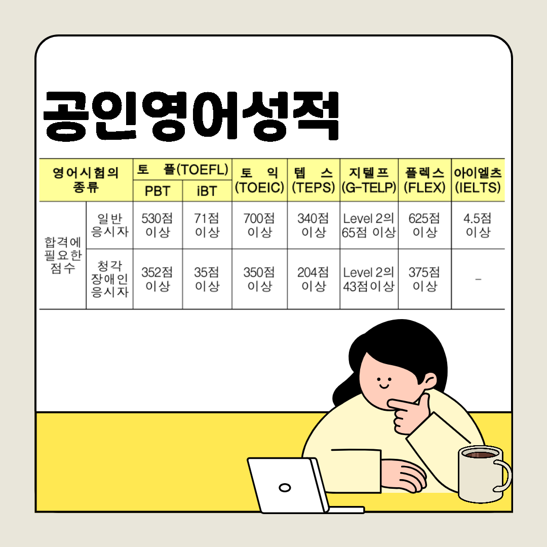 1차 시험 응시자는 TOEIC, TOEFL, TEPS, IELTS 등 공인 영어시험에서 인정 기준 이상의 점수를 취득해야 합니다. 예를 들어, TOEIC 700점, TOEFL iBT 71점 이상이 필요합니다.